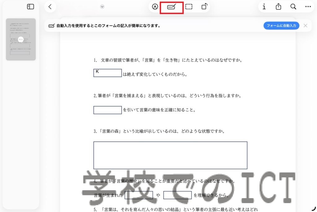 PDFデータにテキスト入力したい場合に、自動入力(署名)のアイコンをタップするだけで