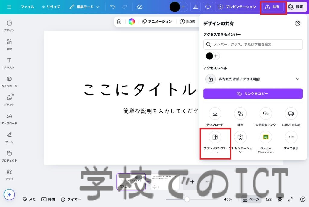 授業で児童生徒がCanvaを使ってチラシやポスター、プレゼンテーションを作成し、共有や提出をする。