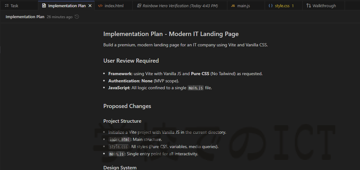 「Implementation Planを修正してください。 – CSSはTailwindではなく純粋なCSSで – JSは1ファイルにまとめてください – MVPなので認証は不要です」