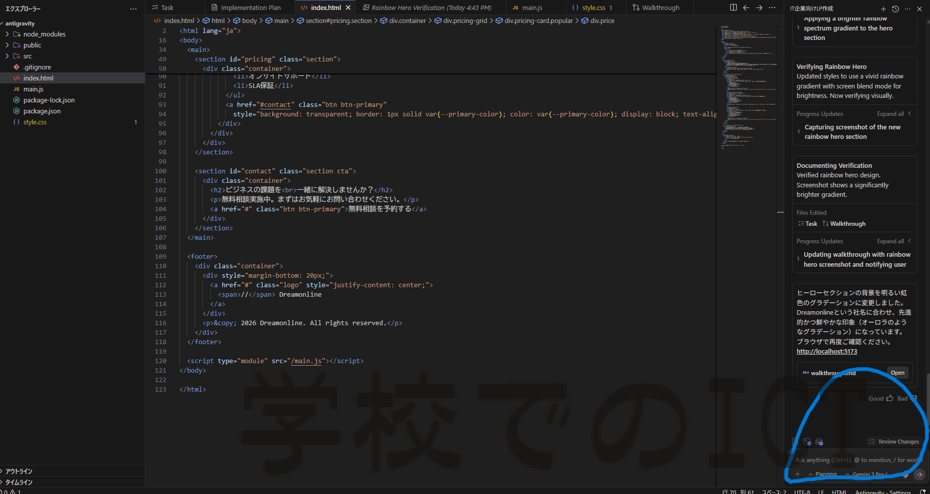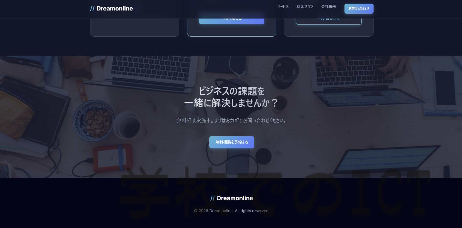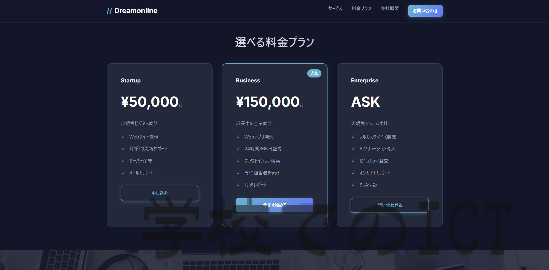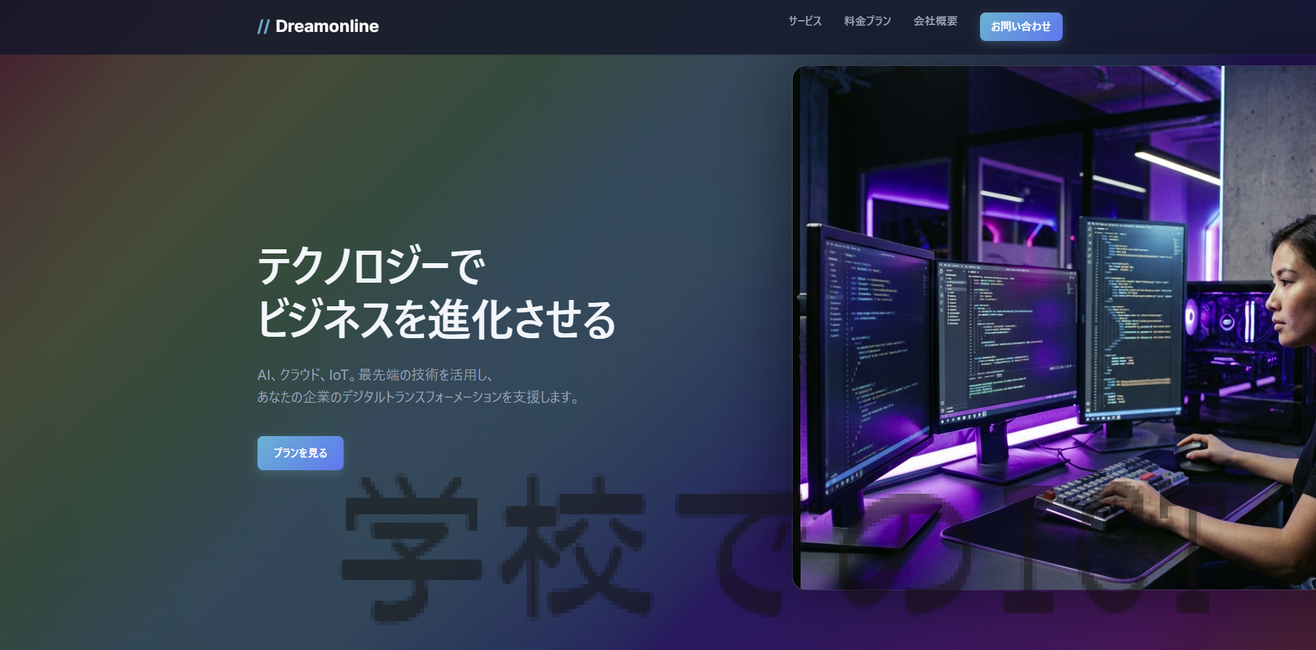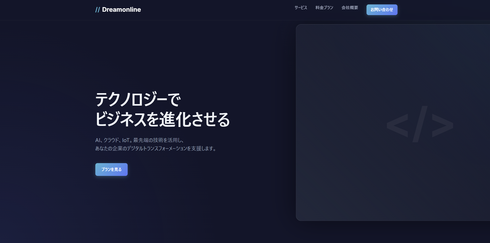 「IT企業向けのランディングページを作って。 ヒーローセクション、料金表、CTAを含めて。 モダンで落ち着いたデザイン。」
