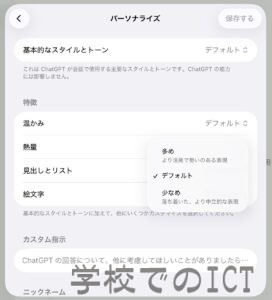 特徴で「熱量」多め、少なめ、デフォルトや「絵文字」を使う量なども設定できます