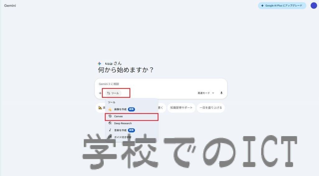 ”Geminiに相談”の下部にある「ツール」を押して「Canvas」を選択します。